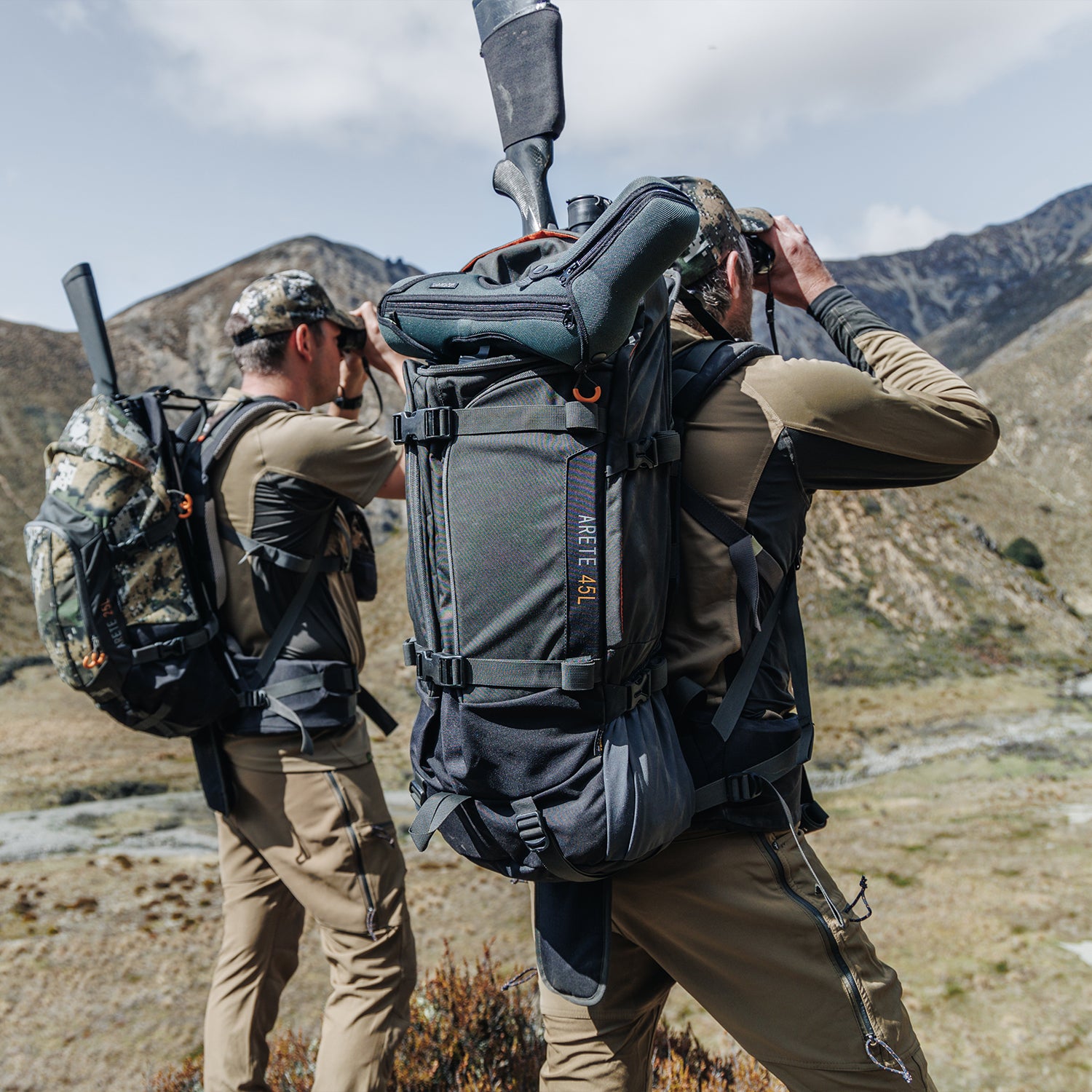 The 45L pack features two grunty, foam covered pockets that protect binos, spotting scopes, cameras and tripods from knocks and movement. ​