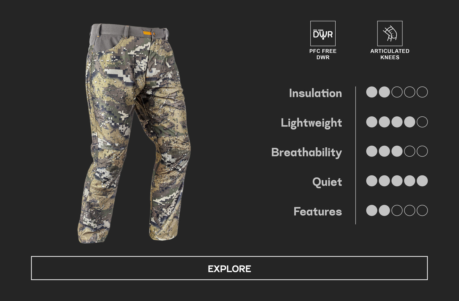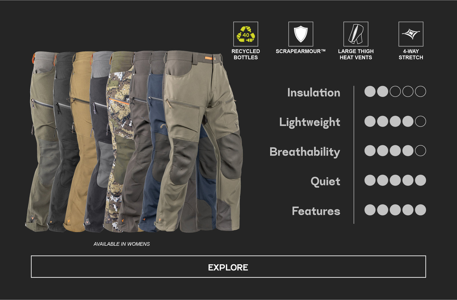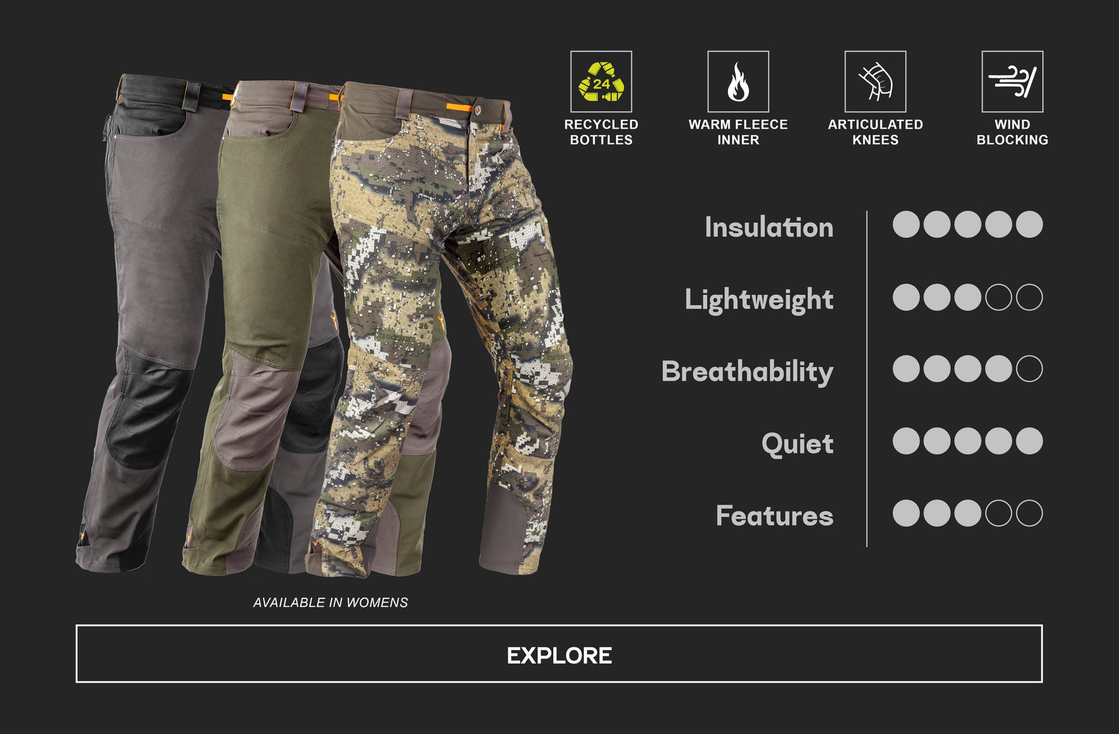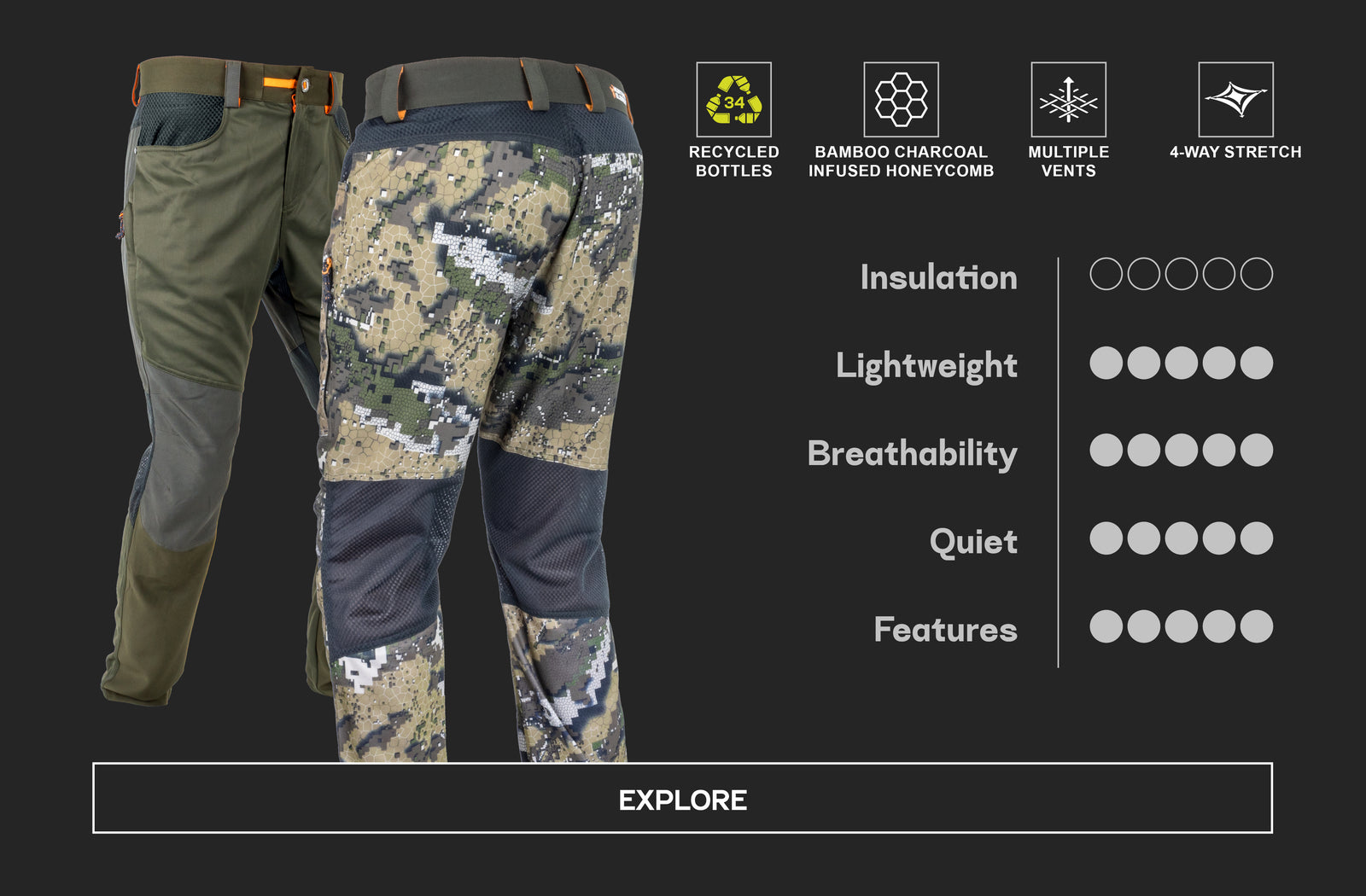 The Hunters Element range is based on a 3-layer system: base layer, mid-layer and outer layer. These mid-layers are designed to be worn above our base-layers (such as the Core or Core+ range) and underneath our outer-layer pants which are designed to withstand extreme elements (such as our Odyssey Pants V2, Downpour Elite Trouser, or Atlas Pants).