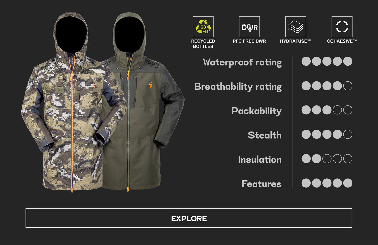 The Downpour Elite is a jack of all trades and is stealthy, ideal for bush stalking. It is well suited to waterfowl hunting as it’s shorter (so it won't get in the way when you’re sitting and wading) and the deep bellowed lower pockets are ideal for dumping ammo.
